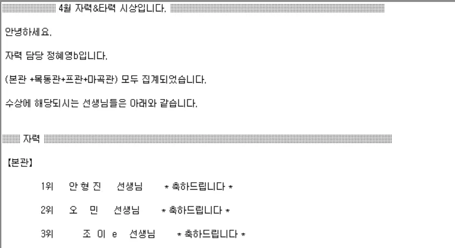 입학 상담 시, 같이 수업을 듣고 싶은 선생님 이름을 알려주시면, 그 결과를 바탕으로 매달 시상을 진행하고 있습니다.