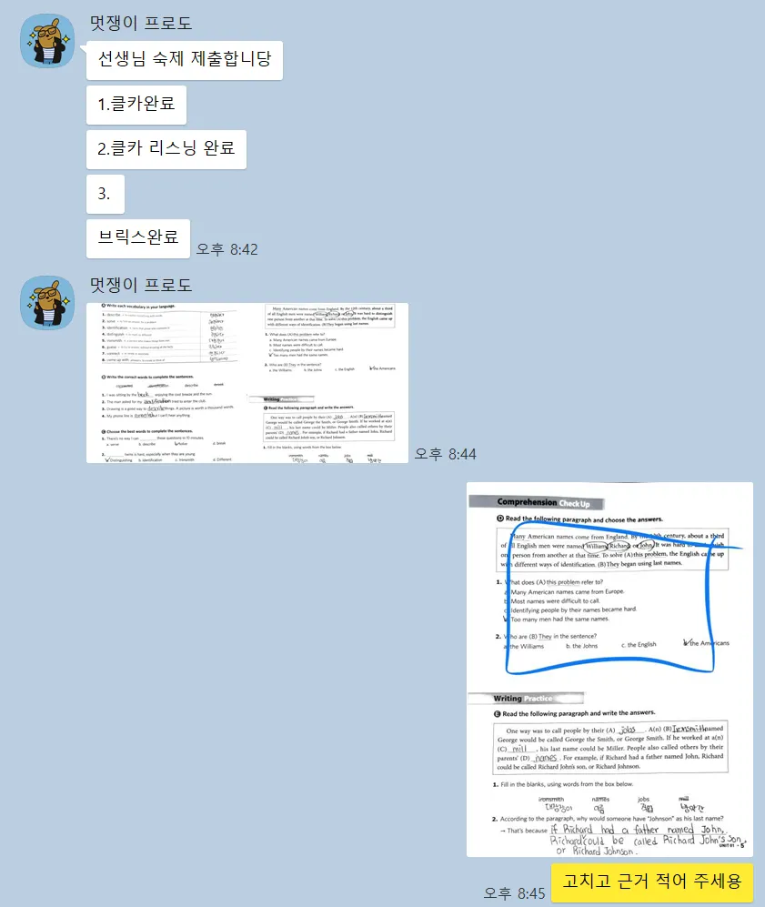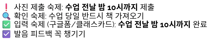 (1)카카오톡(문자) 사진 제출, (2)수업 시간 확인 숙제 (3)온라인 입력 숙제로 구성되어 있습니다.